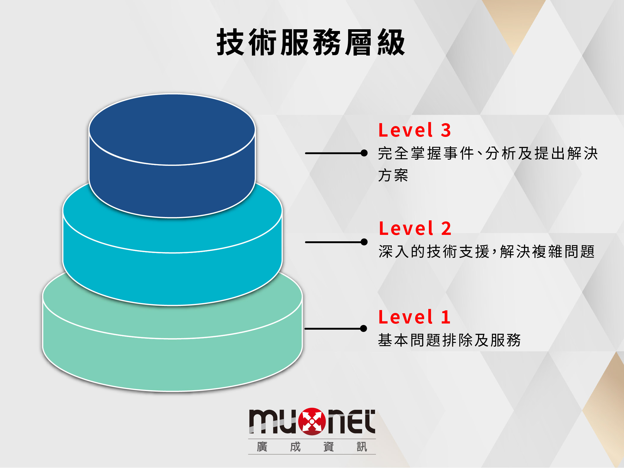 全球數位資訊發展迅速,每個企業在資訊設備或是軟體上的使用都是密不可分,不論企業的規模大小如何,其IT技術服務相當重要,一般企業依照規模大小,可能會設置一位或多位的IT人員,因應公司對內或對外的突發狀況進行處理,當企業發生較為複雜的問題或是無法負擔技術人力時,可尋求外部廠商來協助。 廣成資訊專業技術團隊可依照不同的客戶需求提供下列不同等級之技術支援服務: